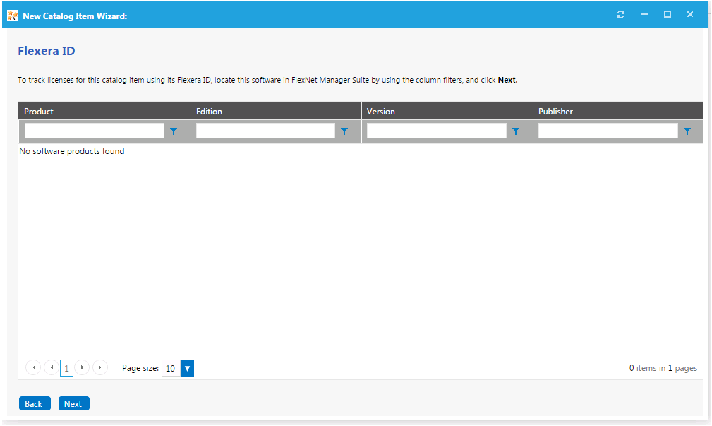 14. When you are finished editing the fields on the Catalog Item Title and Category panel, click Next. If you are connected to FlexNet Manager Enterprise Suite, the Flexera ID panel opens.