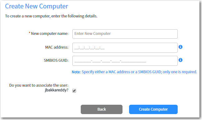 Enter either the MAC address or SMBIOS GUID of the new computer. Only one value is required.