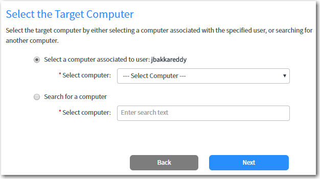• To select one of the computers associated with the specified user to update, select the Select a computer associated to use: USERNAME, and select a computer name from the Select computer list.
