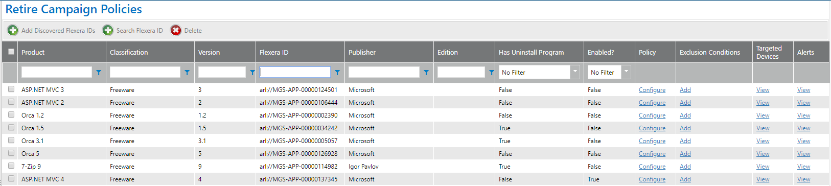 | Search Flexera IDs | Click to create a campaign to retire an application that could be installed in your enterprise in the future. The Search for Flexera ID view opens, listing listing all of the existing applications/versions in the FlexNet Manager Suite database. |