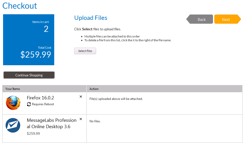 1. Perform the steps in Checking Out. The Upload Files panel of the Checkout Wizard opens.