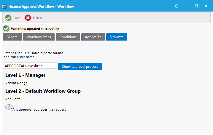 21. Enter the user ID or computer name and click Show approval process. The approval process is displayed:
